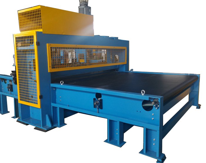 The vertical slitters designed and counted as per the sheet size. The machine is equipped with pneumatic cylinders to ensure pressing and a long PVC conveyor to hold the fabric sheet.