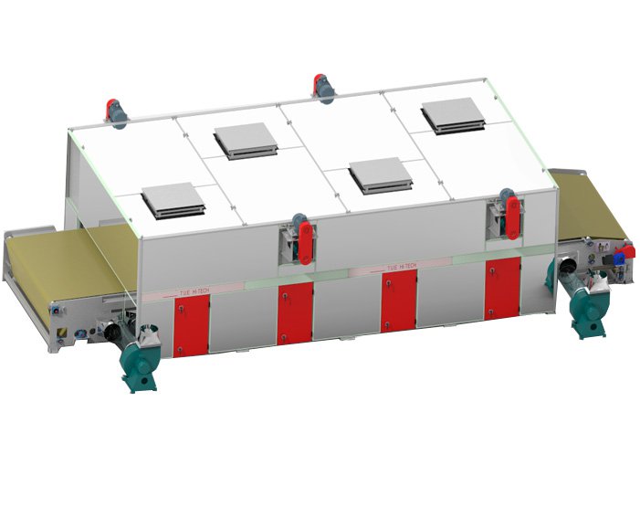 В конструкциях с одинарным или двойным поясом используется теплоизоляция с 3-4 камерами нагрева и 2-3 камерами охлаждения. Система двухленточных печей имеет модульную конструкцию, которая может быть адаптирована ко всем требованиям сушки и термоскрепления. Машина зарекомендовала себя для всех процессов благодаря высокой производительности, идеальной однородности склеивания, а также оптимизированной калибровке, достигаемой за счет идеальной механической конструкции в сочетании с максимальной однородностью воздушного потока и температуры.