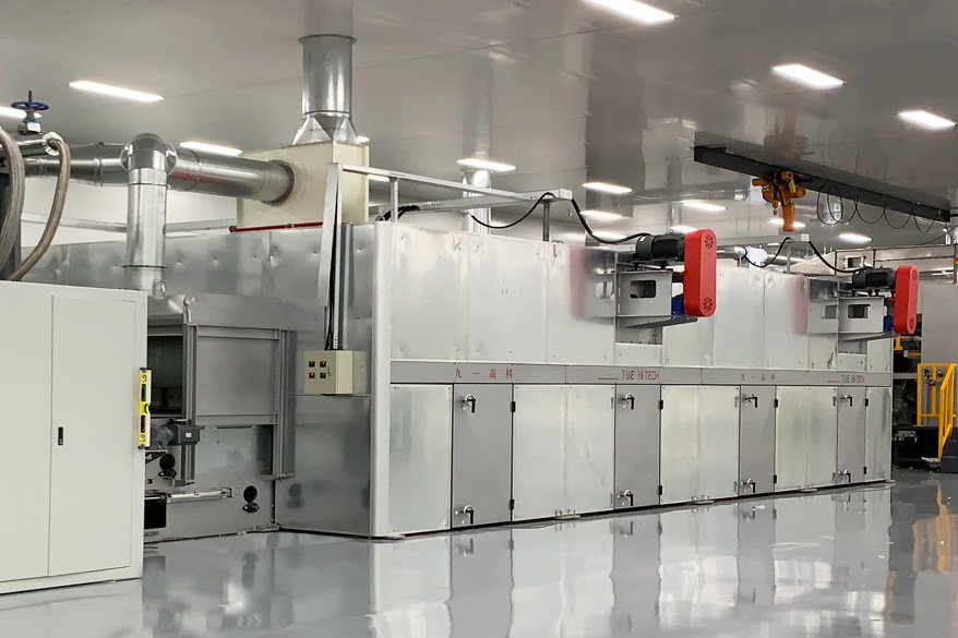 The single belt structures designs the thermal insulation with 8-10meters heating unit and Cooling chambers. The oven system comprises of a modular design, adaptable to all drying and thermobonding needs. The machine recommends itself for all processes for high throughput rates, perfect bonding uniformity as well as optimized calibration achieved through a perfect mechanical structure combined with utmost airflow and temperature uniformity.